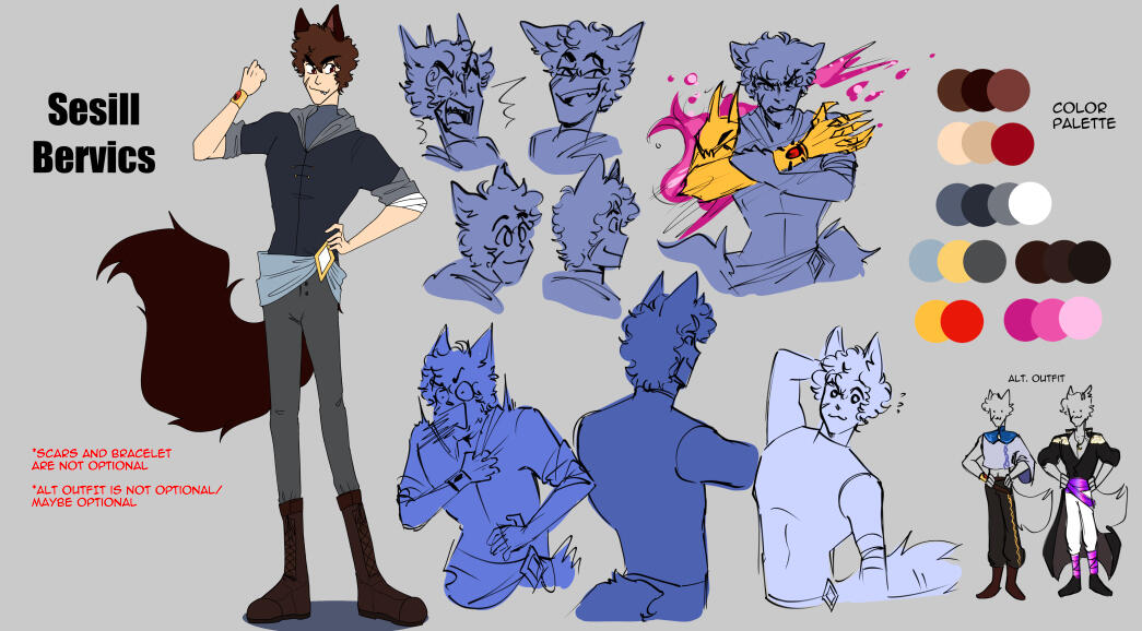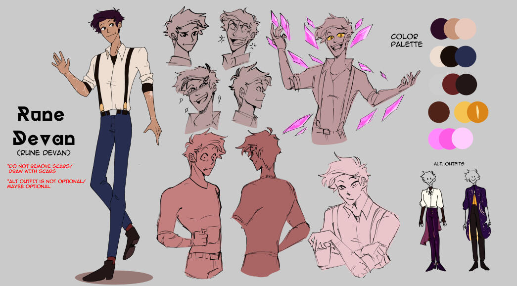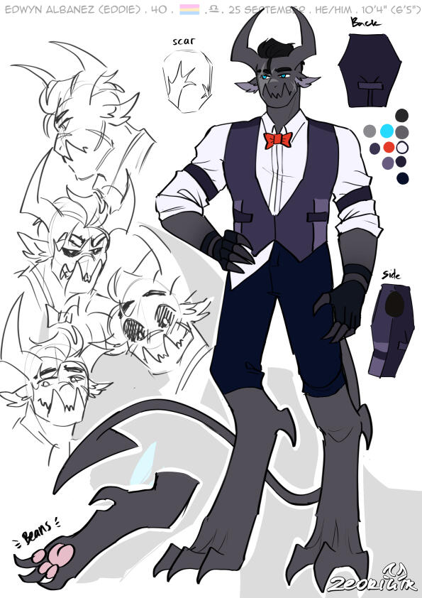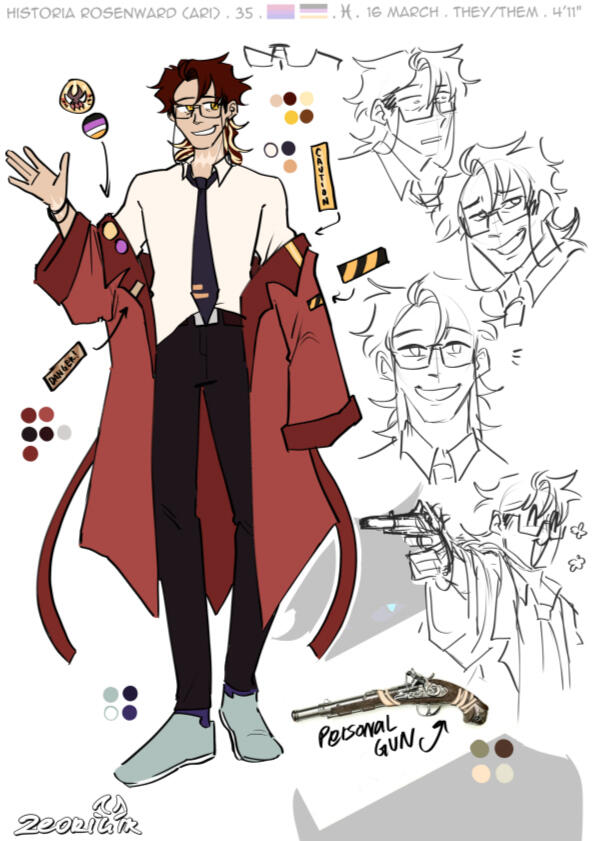he is the definition of a himbo. He has fire elemental powers where can manipulate and absorb them.His hobbies are Exploring, exercise, dancing, listening to music and sewing.He likes to make everybody have a good mood and be the bestest friend he can be. Whenever his friends or close on got sad, he would try his best to cheer them up!He has a fear of ghosts and the ocean.
